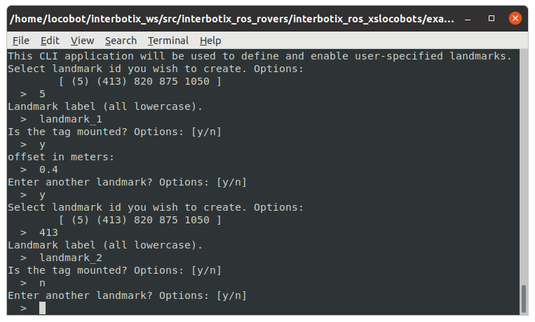 - landmark_manager - Presents a command line application to define landmarks. The manager requests an AprilTag ID out of the list of tags specified in the launch file, a label for the landmark, whether the tag is mounted, and the mounted offset. Once the user is finished entering landmarks, the application will close, and the landmarks will be saved to the specified file.