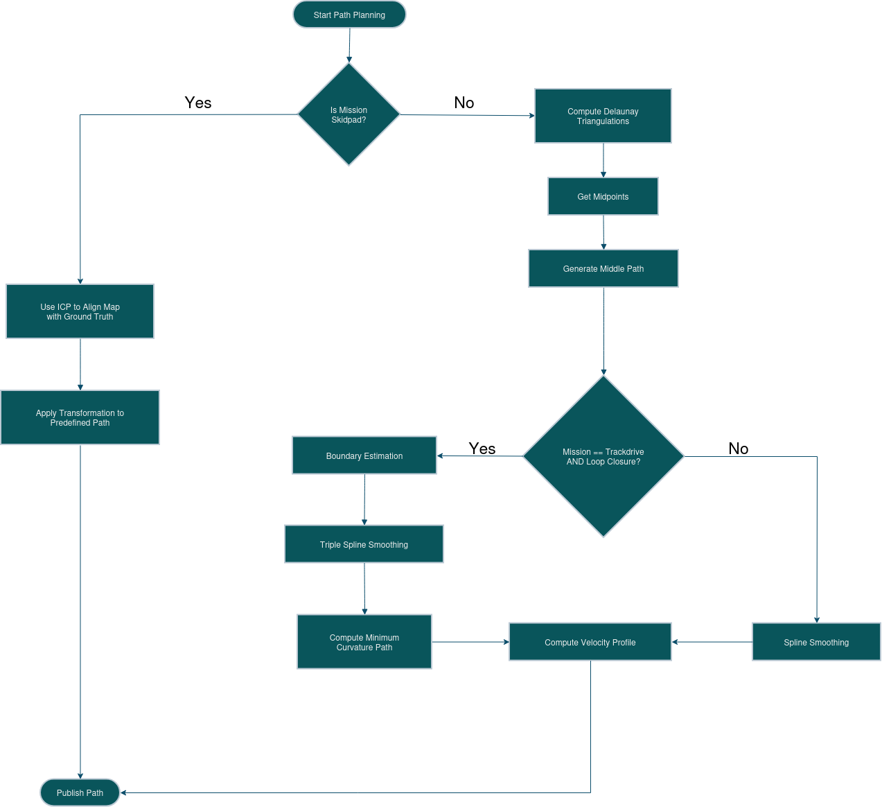 - Other missions: Full path generation via Delaunay triangulation, midpoint extraction, (B-spline smoothing), (minimum curvature optimization), and velocity planning